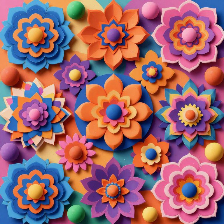 The image presents a stunning, 8k-resolution, top-down view of a vibrant, colorful background filled with an array of geometric shapes and patterns. Dominating the scene are large, intricately designed flowers in shades of blue, orange, pink, and purple, each with multiple layers of petals that create a sense of depth and dimension. Interspersed among the flowers are spherical objects in various colors, including green, yellow, and brown, adding to the visual complexity. The shapes are arranged in a seemingly random yet harmonious manner, creating a dynamic and engaging composition. The interplay of colors is striking, with the bright hues of the flowers contrasting beautifully against the more muted tones of the spheres and the background. The overall effect is one of visual richness and complexity, with each element carefully placed to contribute to the overall aesthetic appeal of the scene.
