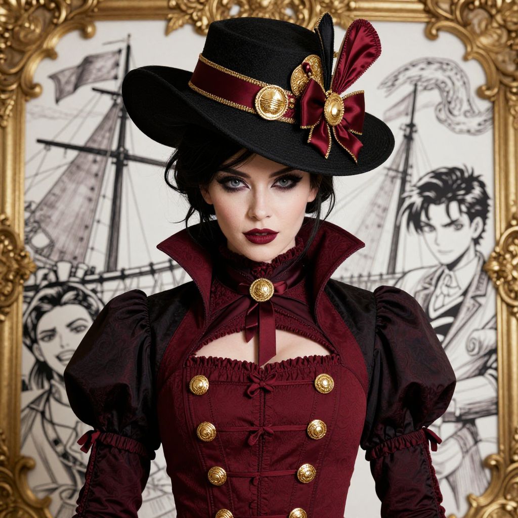 A high-resolution portrait of a woman in a black hat adorned with gold and red accents, wearing a dark crimson and crimson outfit with gold buttons, in a fantasy art style reminiscent of Artgerm, featuring bold, manga-inspired characters with a baroque maritime influence.