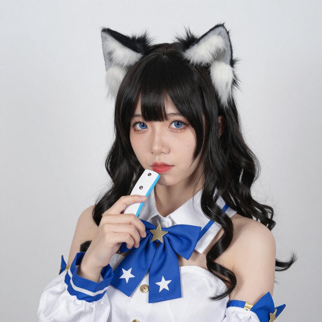 Photograph of an Asian woman with long black hair and bangs, wearing a blue and white cosplay outfit with black cat ears and a blue bow. She has red lipstick and is holding a black hairbrush in her right hand, looking slightly to the side. The background features wooden blinds and bright lighting.