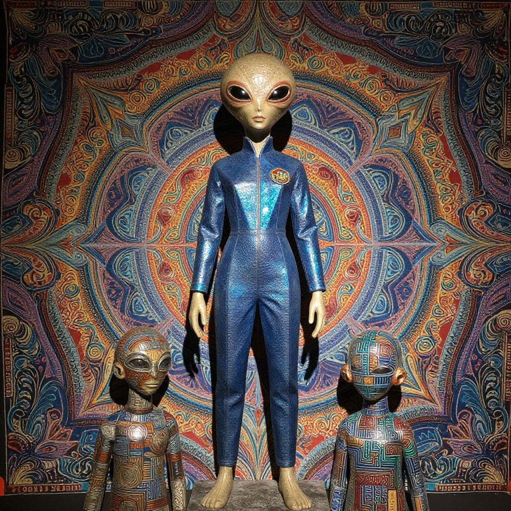 Batik style, wax resist dyed, intricate patterns, colorful, textured which gives the overall appearance an eerie vibe., colorful picture, the image presents a captivating and intriguing sculpture of a head, front facing view, the image features a woman in a fashion show. she is wearing a metallic, creating an atmosphere that is both exhilarating and intense. this image captures a moment of anticipation and excitement, realistic, round headed alien character standing in the center of a colorful and vibrant space time portal. this friendly extraterrestrial is wearing a blue jumpsuit with a small badge on it, highlighting its geometric form against a contrasting field of abstract patterns. overall, they come to rest upon two figures