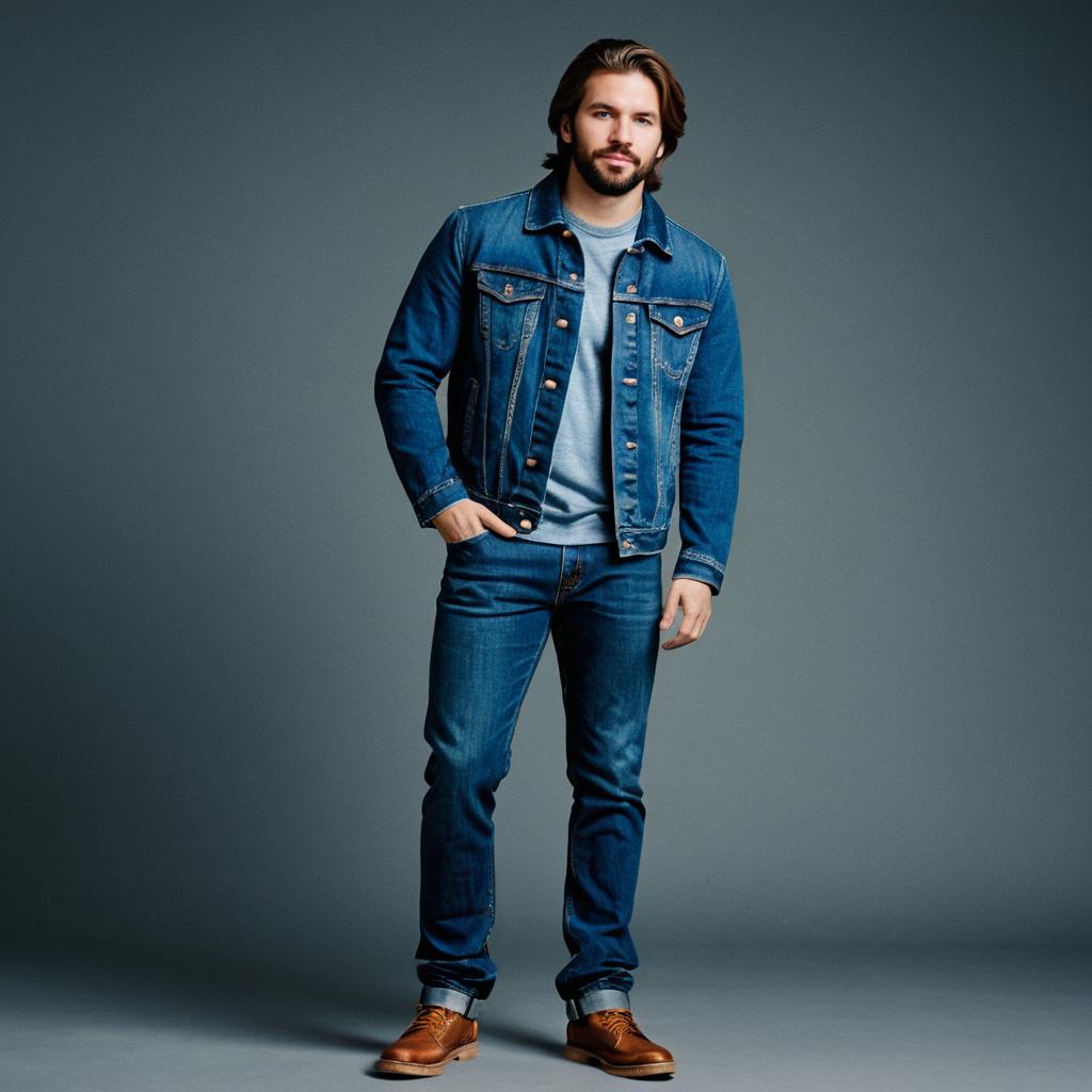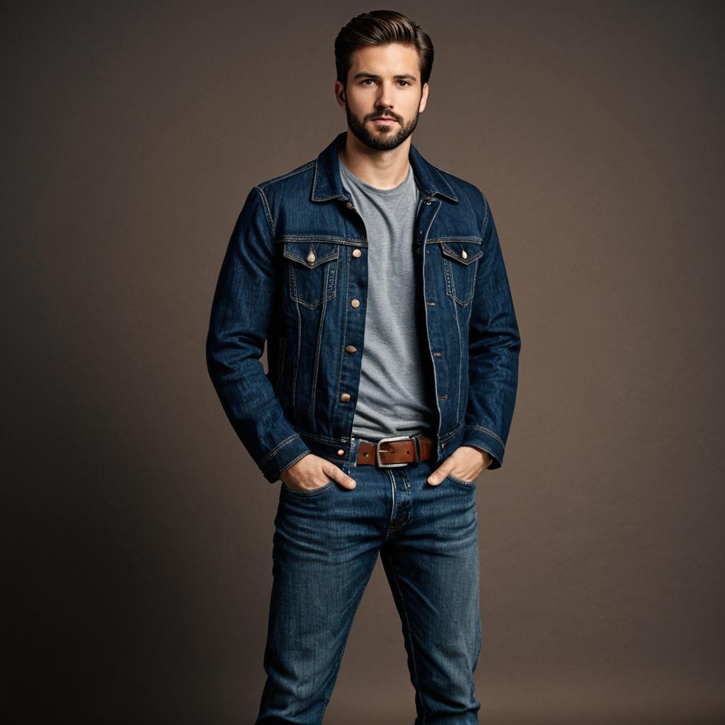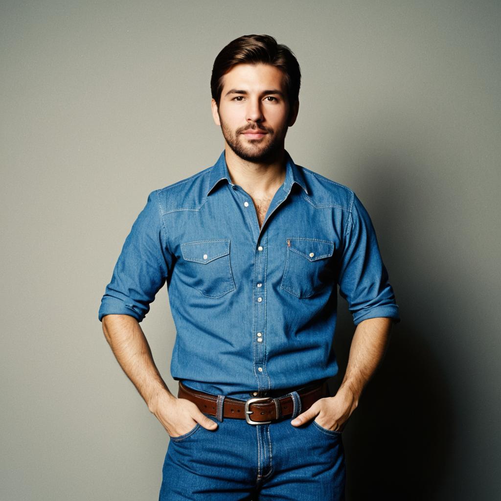 Half trousers man,1boy, male focus, solo, realistic, belt, pants, facial hair, brown hair, shirt, blue shirt, looking at viewer, brown belt, standing, cowboy shot, closed mouth, arms at sides