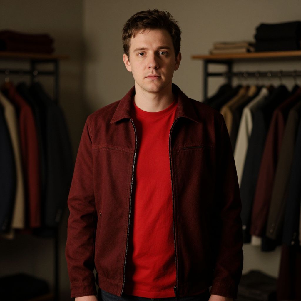 Photograph of a Caucasian man with short, dark brown hair and fair skin, standing in a dimly lit room. He has a serious expression and is wearing a red t-shirt under a dark red, slightly worn, zip-up jacket. The background features a clothing rack with various jackets and coats, mostly in dark colors, and a shelf with stacked items. The lighting highlights the subject, creating a shadowy background. The overall mood is somber and introspective. The man is centered in the frame, looking directly at the camera.