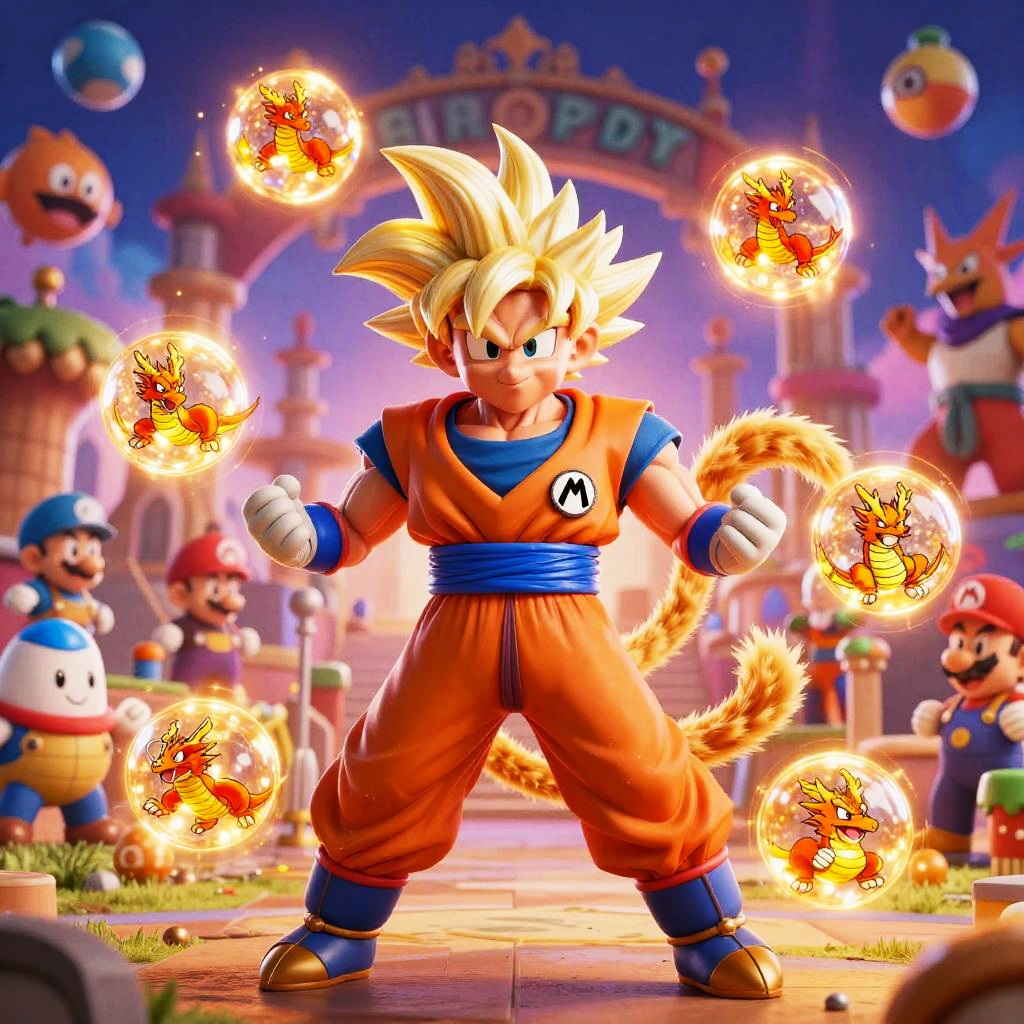 Epic showdown featuring Mario Goku fusion in a fantasy arena, with glowing dragon balls orbiting around, background filled with iconic Mario enemies and Dragon Ball villains, intense lighting effects and dynamic poses, high-detail anime style.