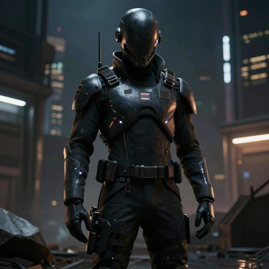 A dynamic portrait of a genetically enhanced insurgent soldier in the rubble of a high-tech urban war zone intermittently lit by security drones, with glowing cybernetic enhancements, volumetric lighting and razor-sharp focus, in gritty hyperrealism fused with Frank Miller’s stark noir contrasts and digital painting vibrancy.