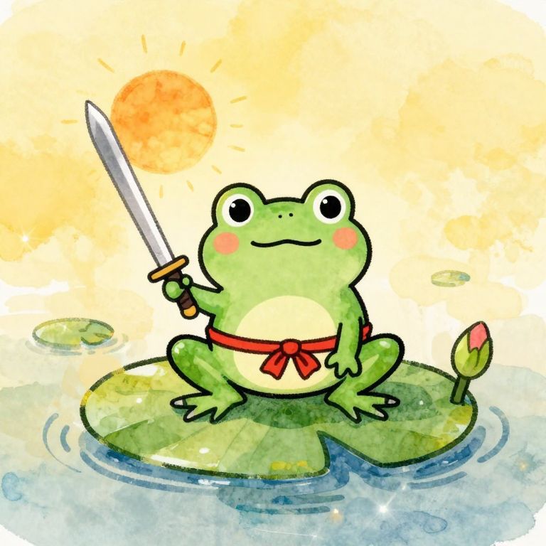 A whimsical illustration of a kawaii frog samurai on a lily pad with his sword, sun behind, hnts of black and red, reminiscent of Beatrix Potter's watercolour style, with loose brushstrokes and soft, dreamy textures, blended with the whimsy of Eric Carle's collage illustrations and the charm of Quentin Blake's playful linework, in a warm, golden colour palette with subtle shading and gentle, expressive character design