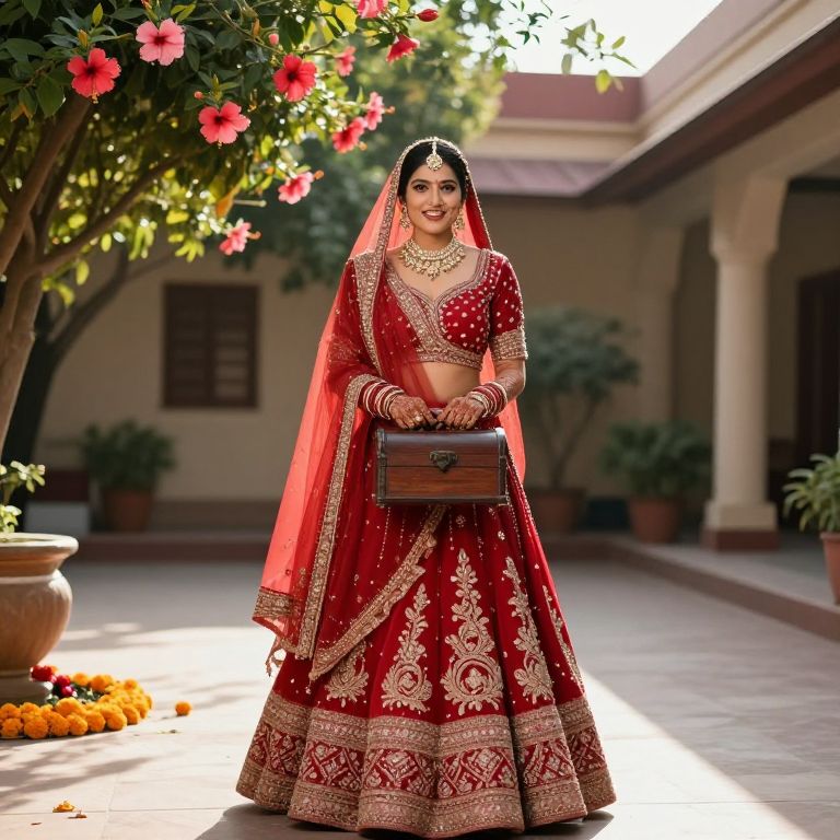 A modern-day bride in a stunning red Banarasi lehenga, posed in a spacious wedding courtyard with blooming hibiscus and marigolds, her face bright and happy, medium-sized nose, full lips, and warm complexion, holding a vintage wooden wedding chest as the afternoon light filters through the leaves.