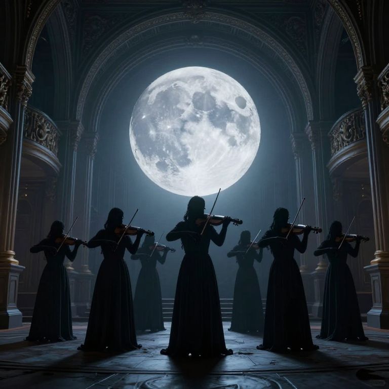 In a hauntingly ethereal 3D-rendered scene, a group of cloaked figures perform a silent symphony with string instruments, their synchronized silhouettes bathed in the eerie glow of a massive, otherworldly moon that dominates the arched doorway of an ornate, abandoned opera house, creating a dramatic interplay of light and shadow.
