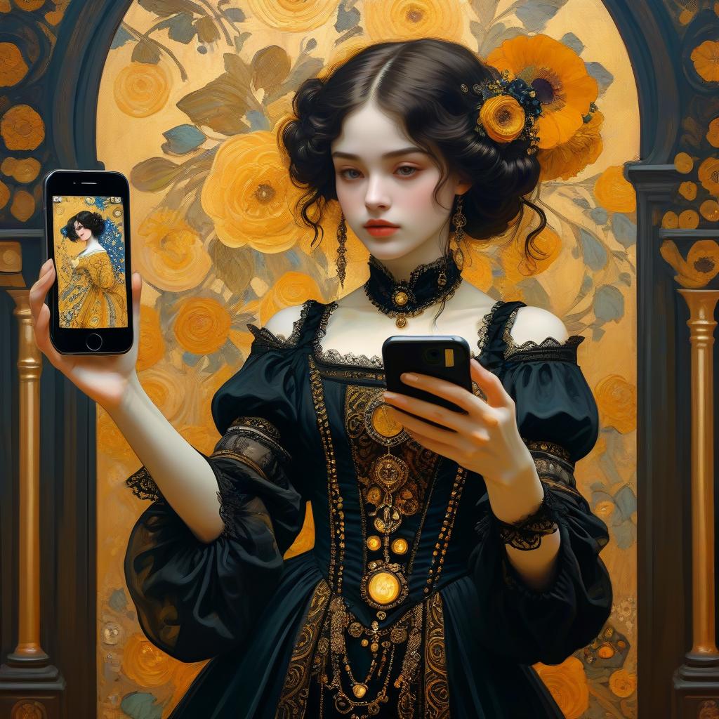 Young gothic woman dancing with an iPhone in her hand, in the style of Gustav Klimt, Alphonse Mucha, Edgar Allan Poe, Victorian and gothic clothing, oil painting style, Victorian aesthetic, high detail