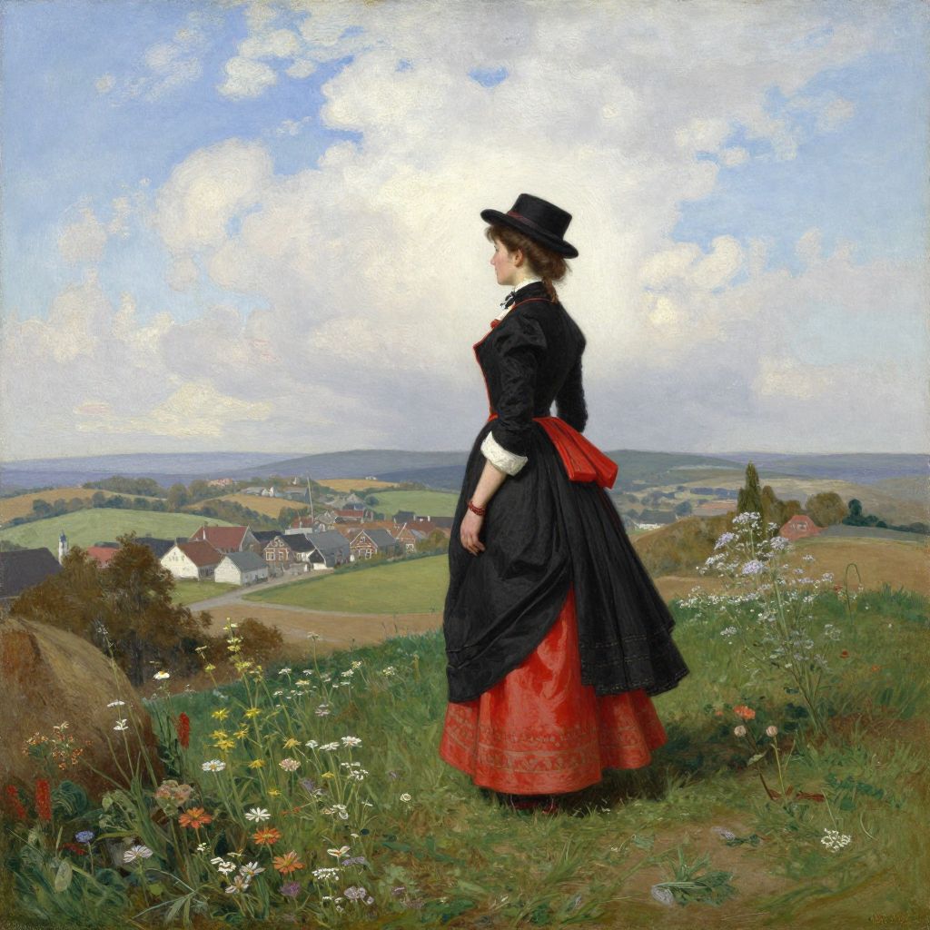 Victorian-style painting of a woman in black dress and hat, red skirt, standing in a colorful meadow, gazing at distant village under a