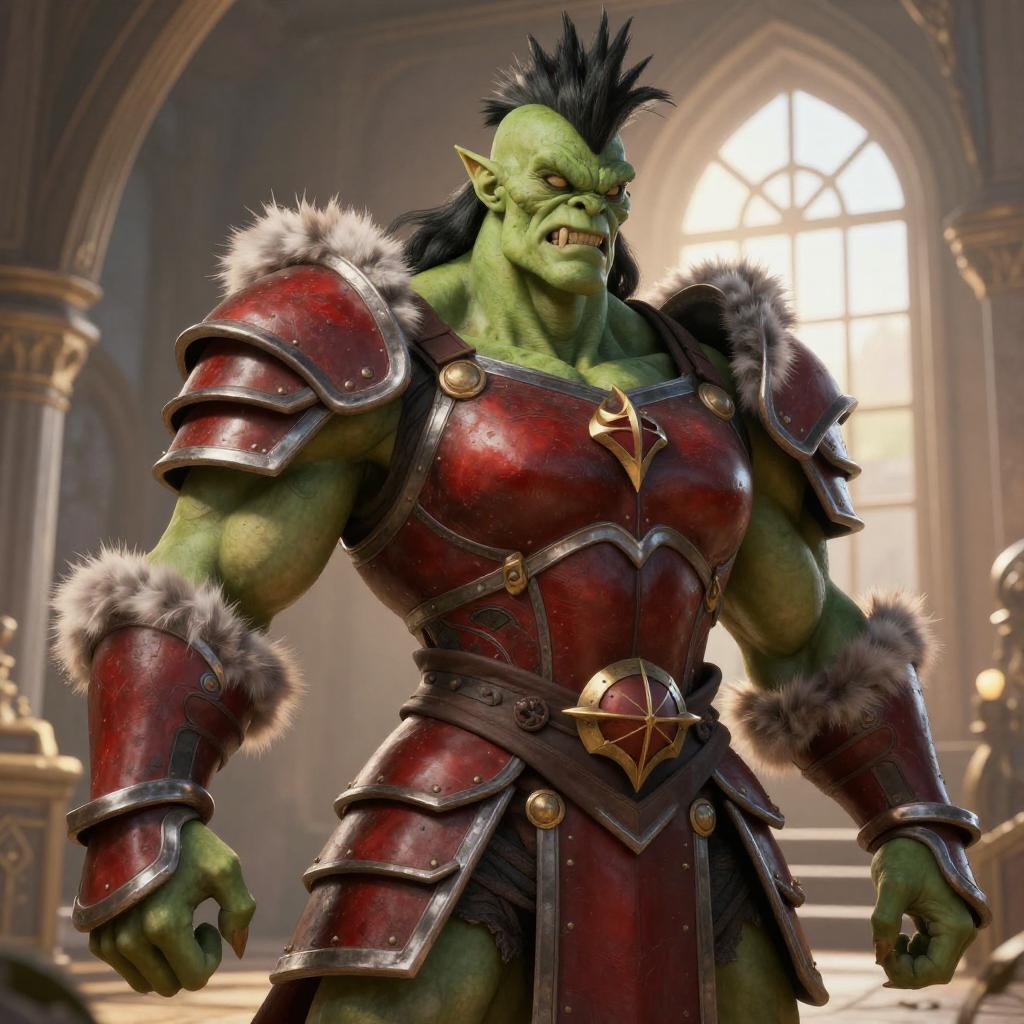 Photorealistic CGI of a muscular, green-skinned orc warrior with black spiky hair, wearing red armor with fur trim, in a grand,
