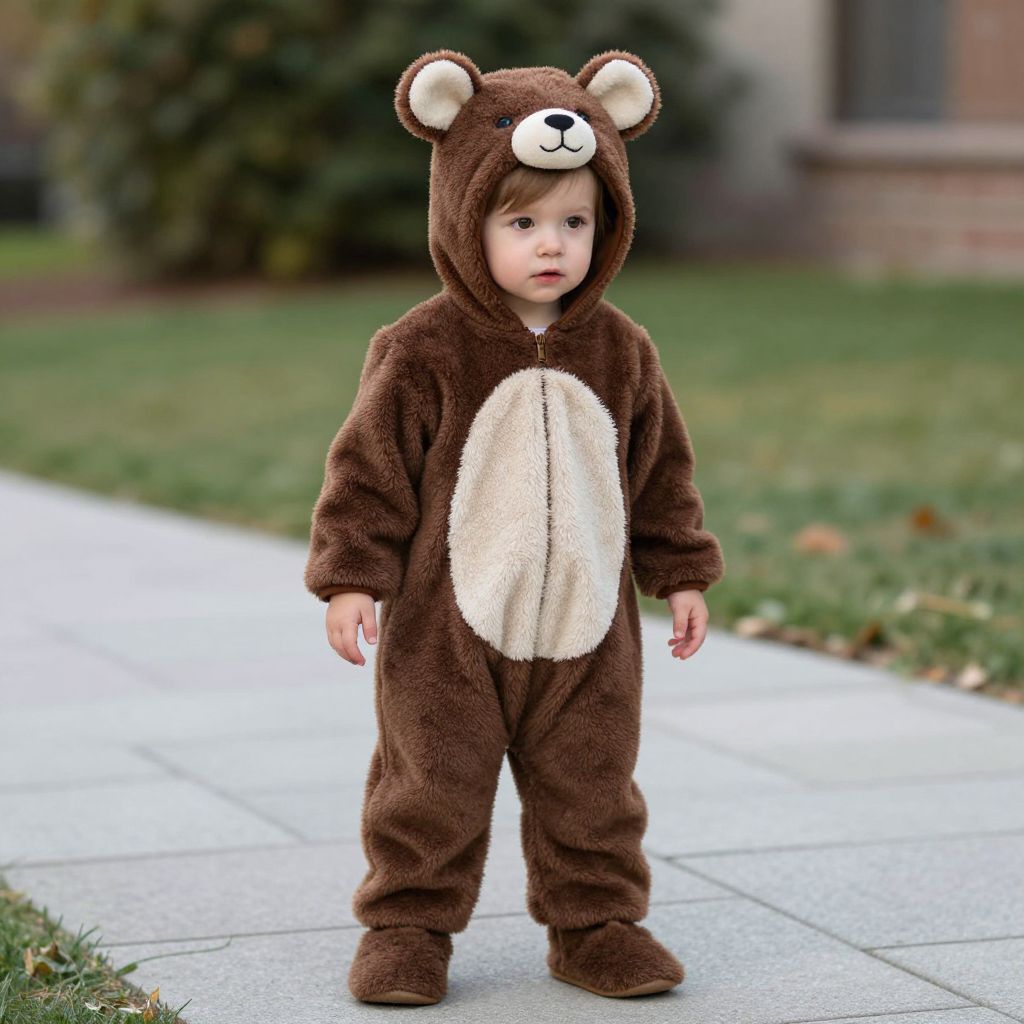 Base Childwear Costume, toddler dressed in a brown bear costume standing on a sidewalk