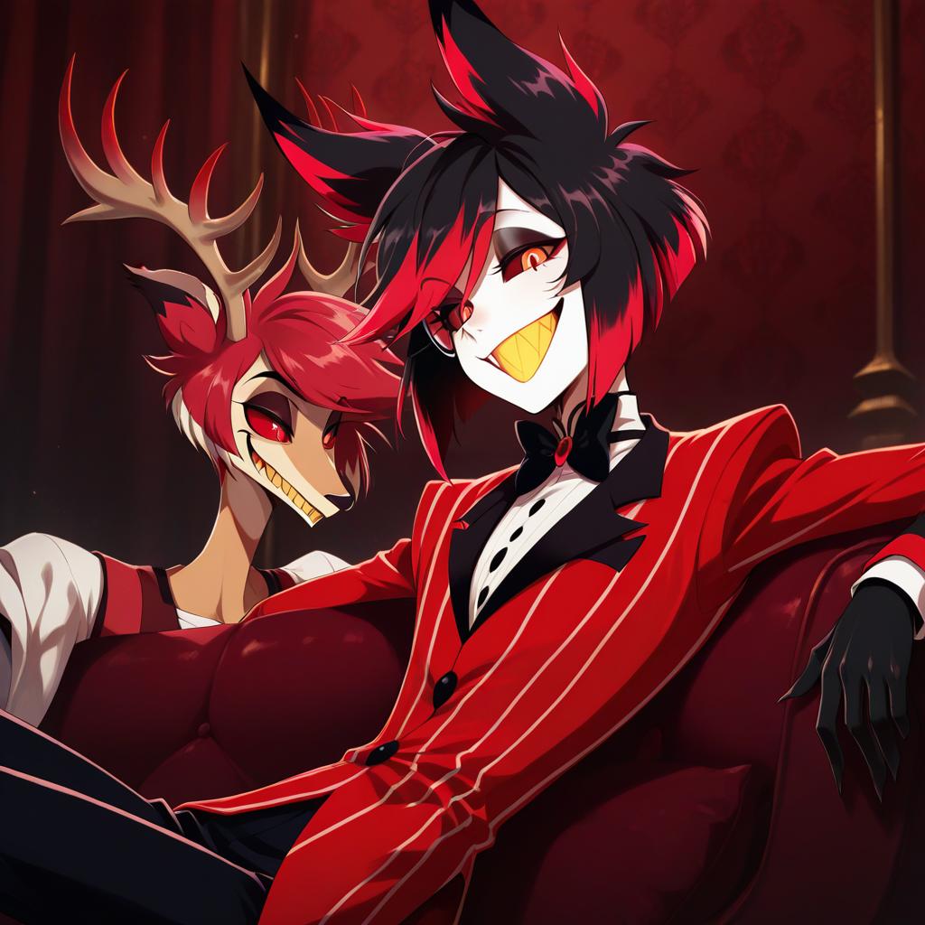 Alastor (hazbin hotel), hazbin hotel, 1boy, demon boy, demon, sharp teeth, horns, deer ears, yellow teeth, red eyes, red hair, short hair, black hair, red suit, suit, black bowtie, long sleeves, deer antlers, red sclera, deer boy, monocle, by artist samidare (hoshi), anime