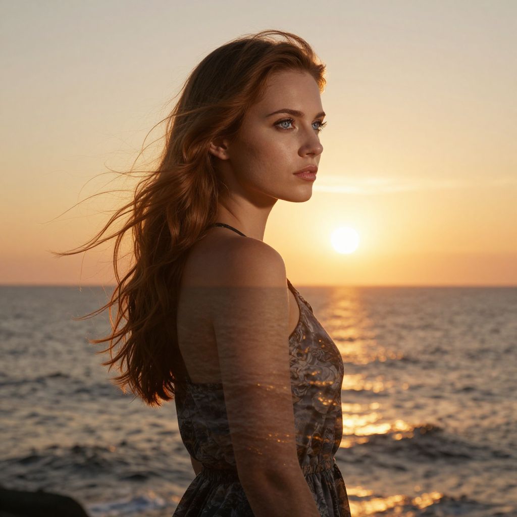 A mesmerizing double exposure portrait showcases an enigmatic woman with piercing blue eyes and flowing chestnut hair, her silhouette gracefully merging with a serene sunset over an expansive ocean. The radiant golden light of the sun harmonizes with her attire, casting an ethereal glow that accentuates her delicate features. Standing at the water's edge, her gaze fixed on the horizon, the image captures the dichotomy between the warmth of human connection and nature's boundless beauty. Through this captivating fusion of light and shadow, viewers are invited to contemplate the interplay between inner strength and the vast unknown beyond our reach.