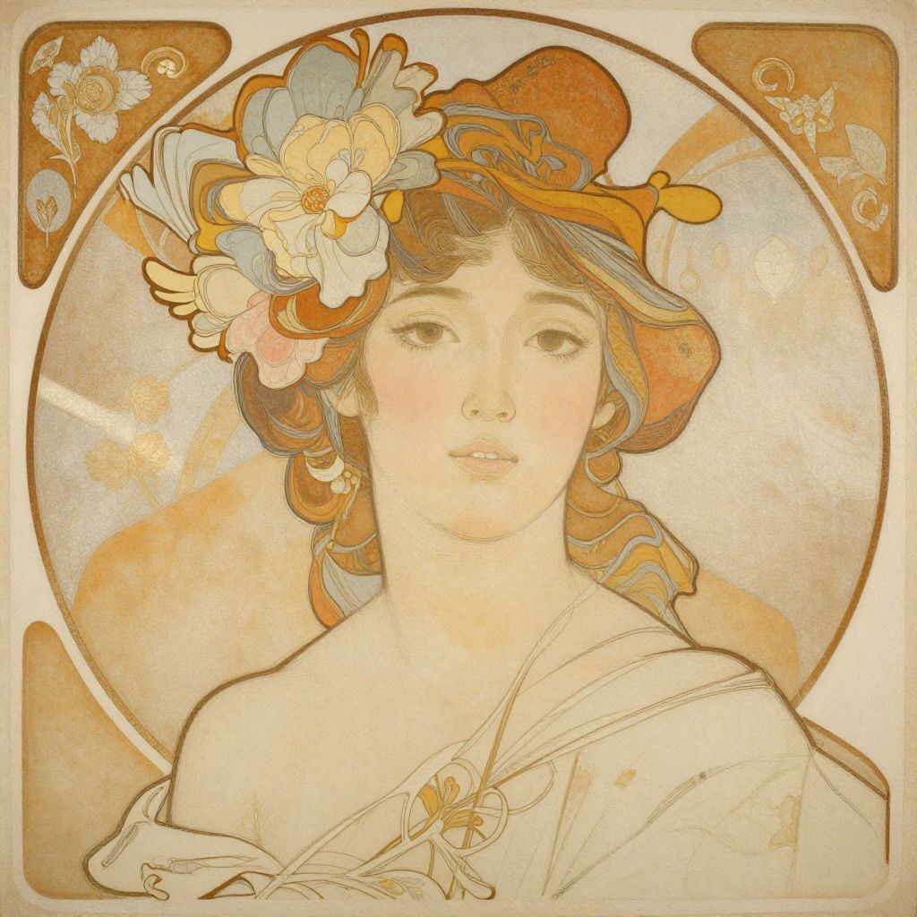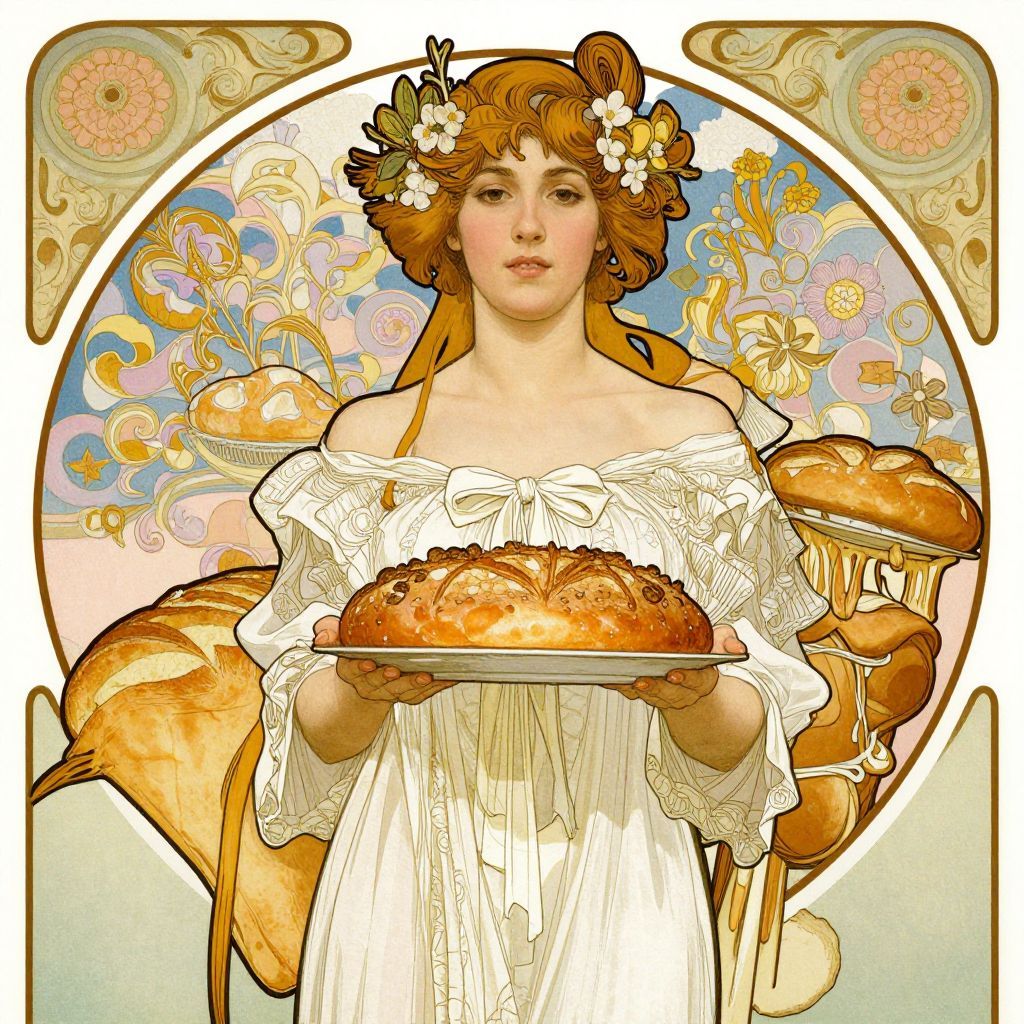 In this Alphonse Mucha art nouveau illustration, a blonde-haired lady gracefully holds a plate of bread, surrounded by an array of baking goods. Her intricate hairstyle, adorned with delicate flowers and leaves, complements her elegant attire, which features a white dress with ruffled sleeves and a bow at the neckline. The background is a harmonious blend of soft pastel colors, with swirling patterns and floral motifs that enhance the overall vintage aesthetic. The bread, with its golden crust and intricate toppings, is placed strategically in the foreground, drawing the viewer's attention to the central figure. The composition is balanced, with the lady positioned centrally, and the bread and baking goods arranged symmetrically around her, creating a sense of harmony and balance. The interplay of colors, textures, and shapes in this artwork captures the essence of the art nouveau style, evoking a sense of nostalgia and elegance.