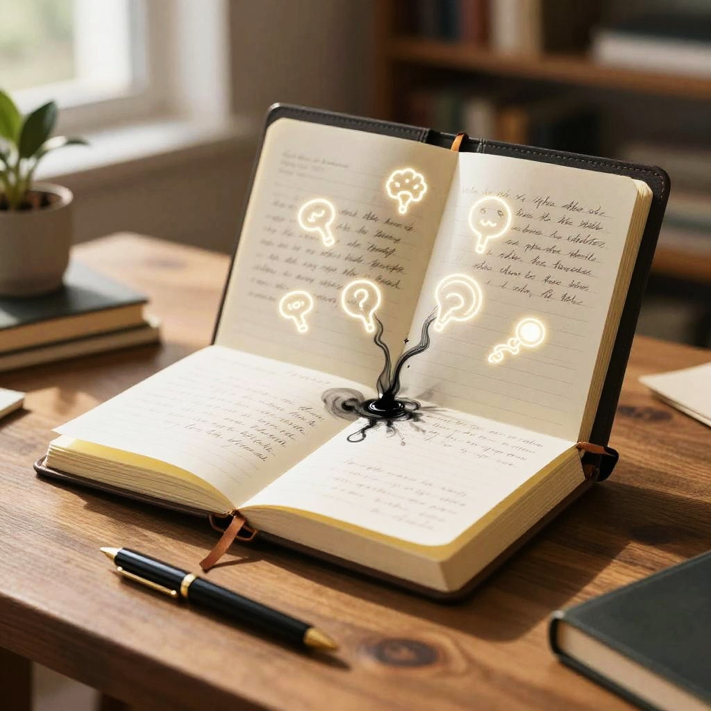 Journal generator concept, featuring a futuristic digital device creating personalized handwritten journal pages with ink flowing magically onto paper, surrounded by glowing symbols of creativity and thought, in a cozy, sunlit study room, hyper-realistic style