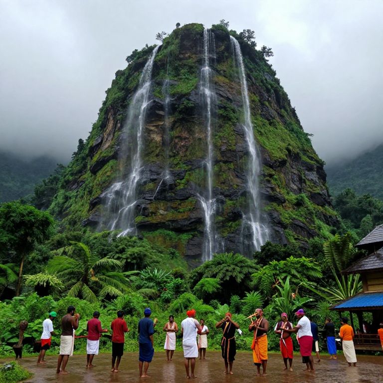 Govardhana hill during the monsoon season, towering with vivid greenery and waterfalls cascading down its sides, thick clouds rolling in the sky, farmers and villagers celebrating with traditional music and dance in the foreground, rich in cultural heritage.