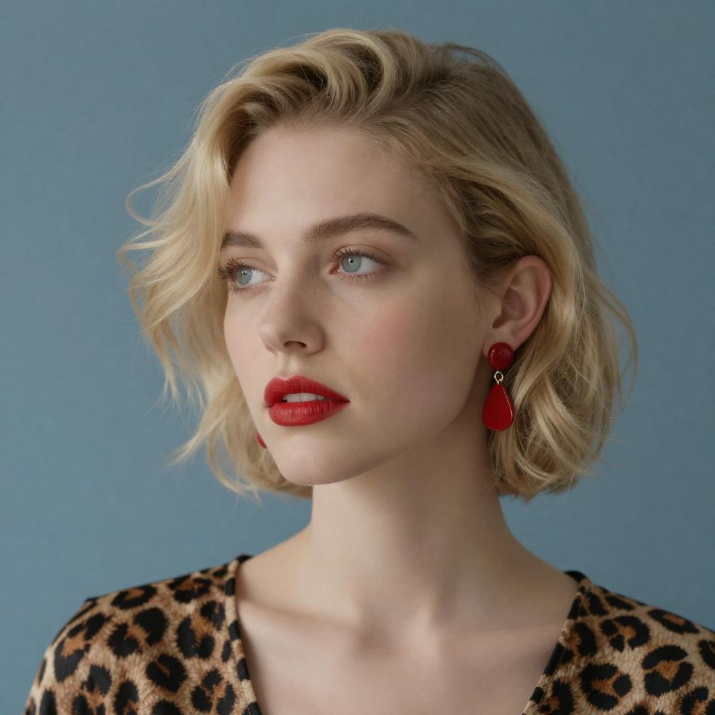 Blonde woman with short, wavy hair and red lipstick, wearing red earrings and a leopard print top. Blue background. She looks intently to the side. Soft lighting. Close-up portrait.