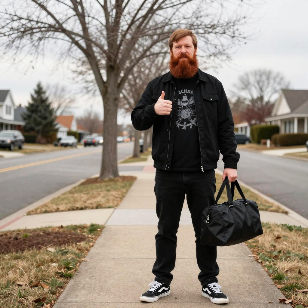 Photograph of a bearded white man standing on a suburban sidewalk. He has a full red beard and light brown hair, wearing a black jacket over a black graphic T-shirt, black pants, and black and white sneakers. He holds a black duffel bag in his right hand and gives a thumbs-up with his left hand. The background shows a leafless tree, a street with parked cars, and houses. The sky is overcast, and the grass on the sides of the sidewalk is patchy. The image has a slightly high-contrast, almost surreal quality.