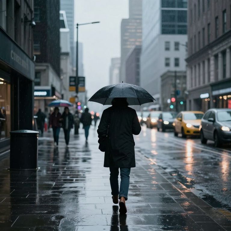 Amidst the hushed symphony of a rain-soaked metropolis, a solitary figure traverses the gleaming streets, embodying the quiet resilience of the urban soul as it navigates the interplay of solitude and collective dreams.