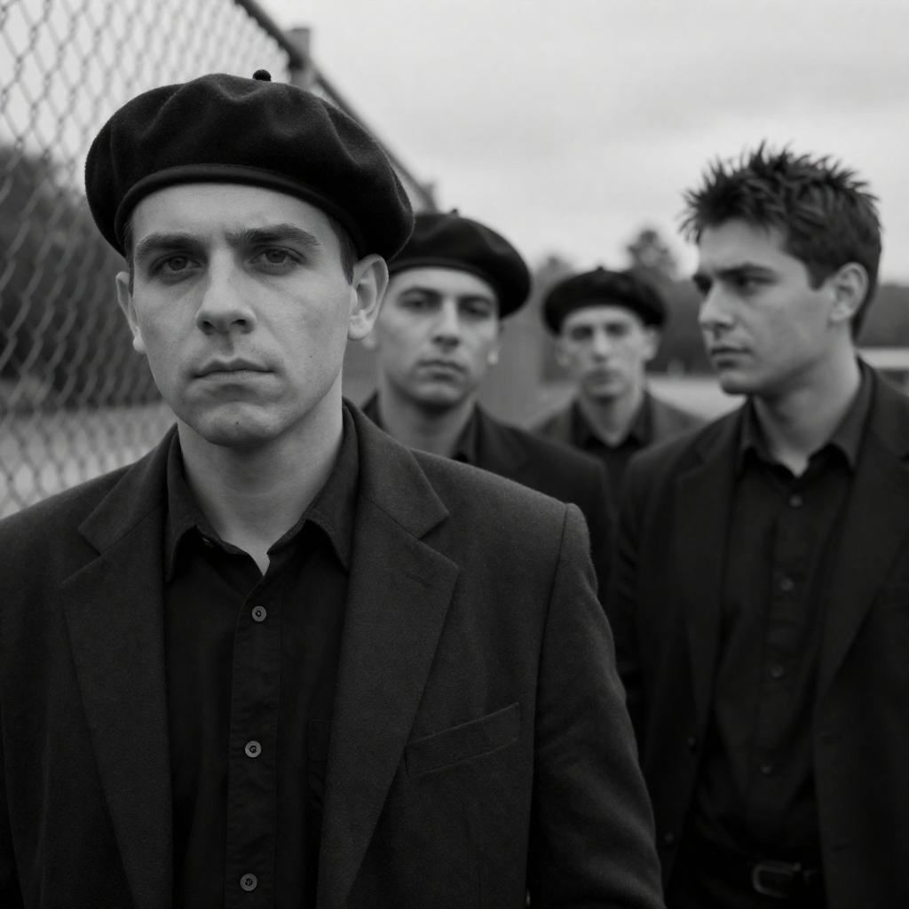 Black-and-white photograph of four men in dark clothing, standing outdoors near a chain-link fence. The man in the foreground has a serious expression, wearing a beret. Two men behind him wear similar dark hats, while the fourth man, with spiky hair, looks to the side. Background includes trees and a cloudy sky.