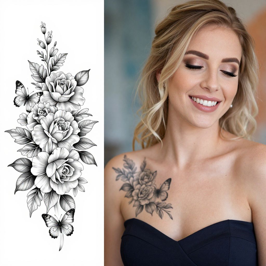 This image is a split photograph. The left side features a black and white floral tattoo design with detailed roses and butterflies on a white background. The right side shows a close-up of a woman with light skin and blonde hair, smiling with eyes closed, wearing a strapless dress with a matching floral tattoo on her upper chest. The background is blurred with soft blue and orange hues.
