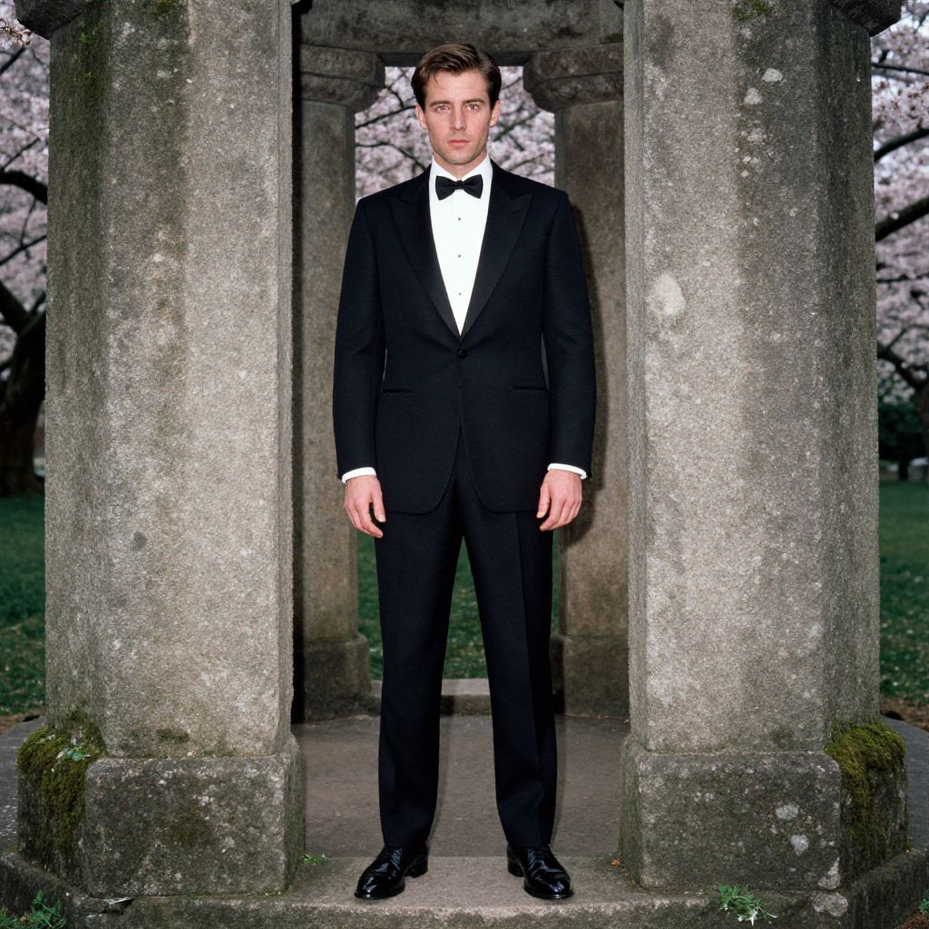 A man, black satin lapel tuxedo, crisp white dress shirt, black bow tie, black patent leather shoes, tailored fit, classic elegance, ancient stone pillars, moss-covered, surrounded by cherry blossoms, kodak sp analog photo, confident expression Man has masculine face and piercing eyes