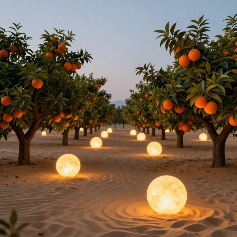 Photograph of a glowing orange grove at dusk, with spherical lanterns illuminating the sand beneath fruit-laden trees, creating a magical, eth