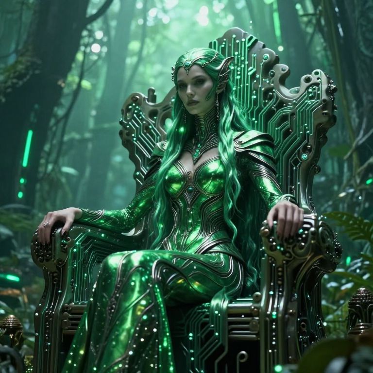 Alien empress in a green metallic avant-garde ensemble, her long silken hair shimmering like liquid metal, seated on a throne made of interlocking organic circuits in a desolate, neon-drenched alien jungle at dawn, her serene face illuminated by the soft green glow of the environment, her expression both powerful and mysterious.