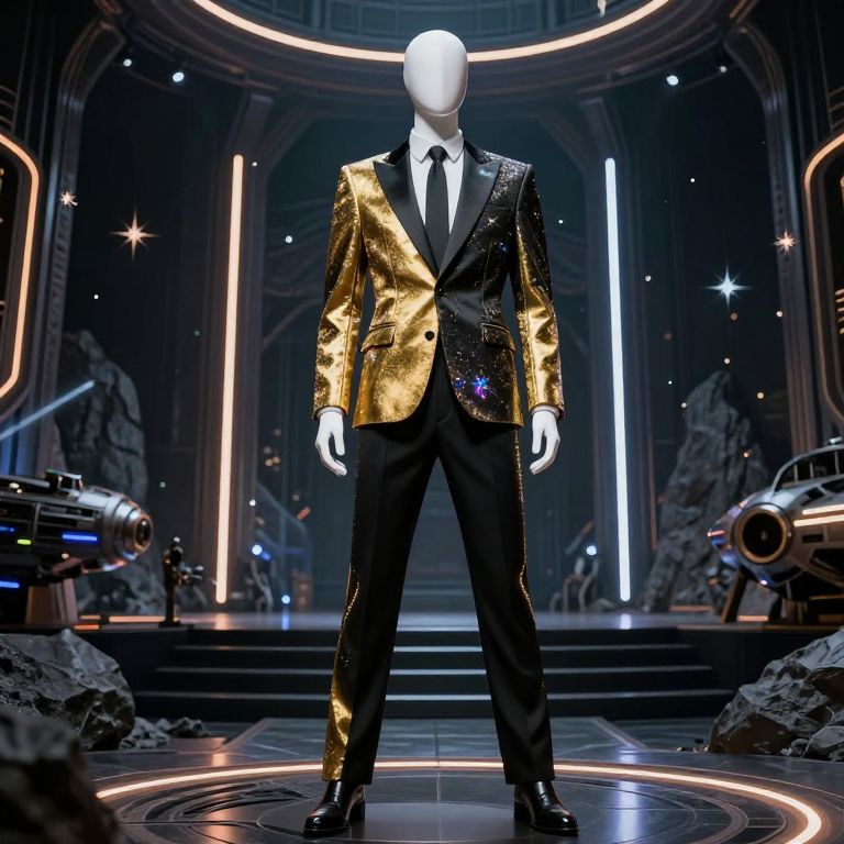 Photograph of a headless, white-faced mannequin wearing a black tuxedo with a striking, gold sequined jacket. The mannequin stands confidently on a circular, illuminated stage with a sci-fi theme. The background features dark, arched walls with bright, vertical neon lights and star-like sparkles. On either side of the stage are large, futuristic cannons and rocky formations. The mannequin's black trousers and shiny black shoes complete the formal attire. The overall scene is dramatic and high-tech, blending elegance with a futuristic, space-age aesthetic.
