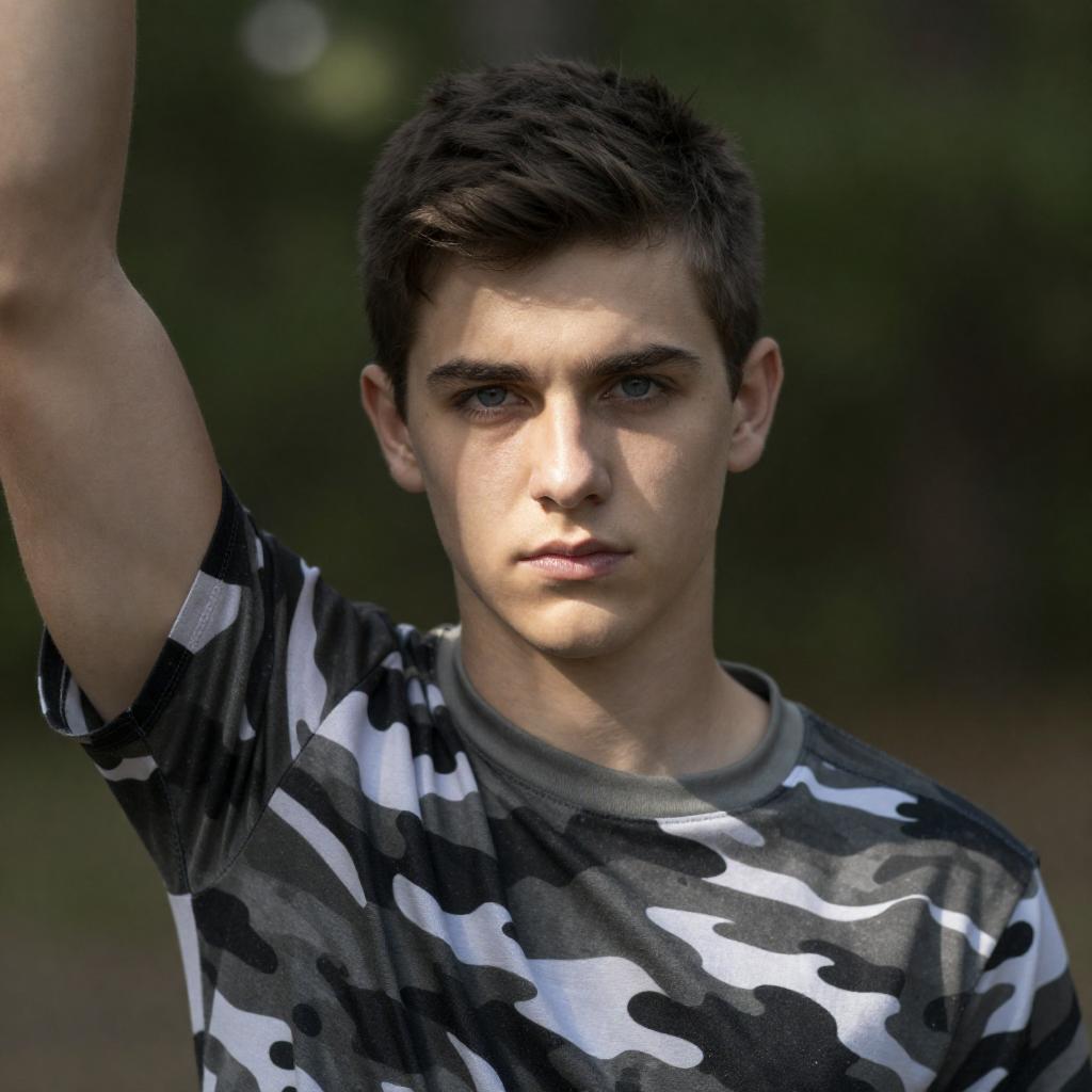 Photograph of a young man with short, dark brown hair and blue eyes, wearing a black and white camouflage shirt. He has a serious expression, with sunlight casting shadows on his face. His right arm is raised, and he is outdoors with a blurred green forest background.