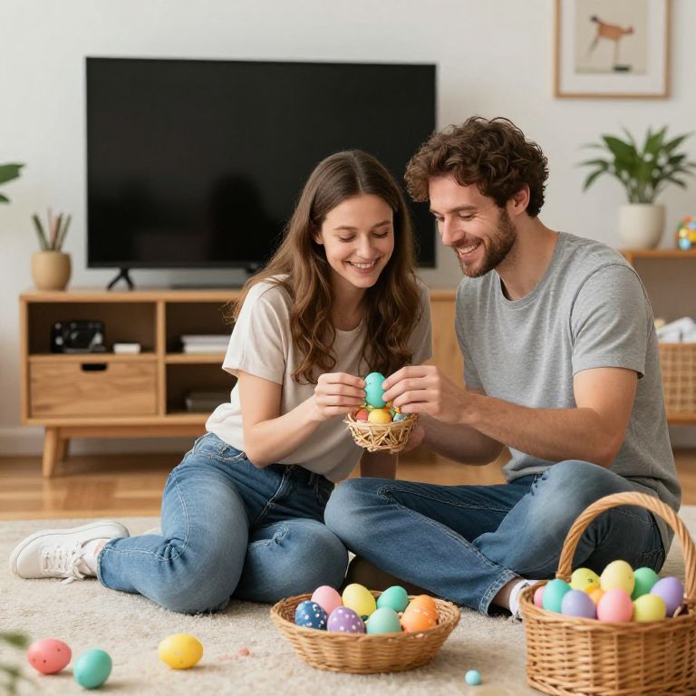 Photograph of a young couple with fair skin, sitting on a light-colored carpet in a modern living room. The woman with long brown hair and wearing a white t-shirt and blue jeans smiles while holding a wicker basket of colorful Easter eggs. The man with curly brown hair, a beard, and a gray t-shirt, also in blue jeans, looks at her with a smile while helping with the eggs. Two wicker baskets filled with colorful eggs are on the carpet in the foreground. A flat-screen TV and wooden storage unit with potted plants are in the background, along with a framed picture on the wall.