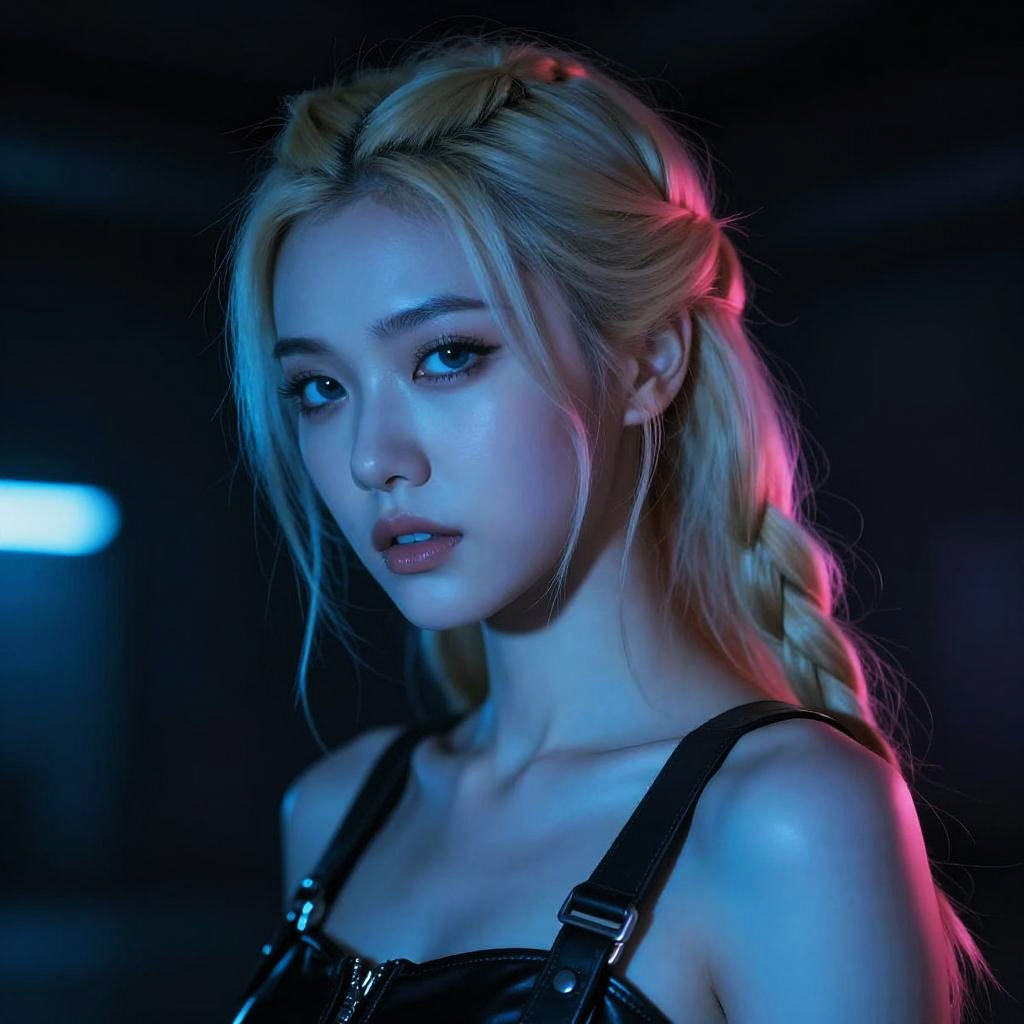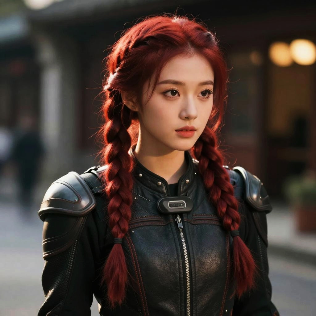 Photorealistic CGI of an Asian woman with red braided hair, wearing black armored leather, standing in a blurred urban setting.