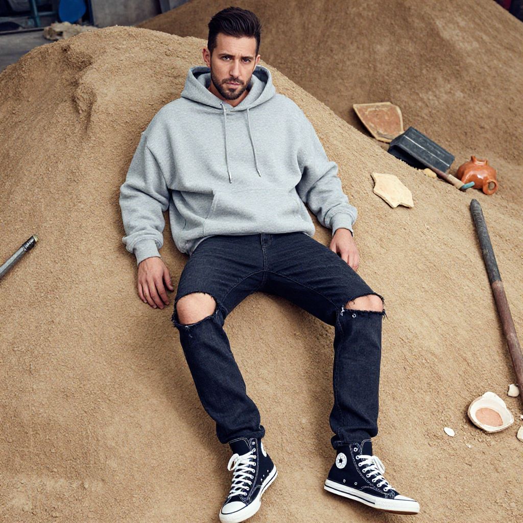 A man, oversized gray hoodie, dark wash ripped jeans, black high-top sneakers, urban aesthetic, laid-back look, dusty earth mounds, scattered tools, ancient pottery shards, cinecolor, relaxed expression. Man has masculine face and piercing eyes