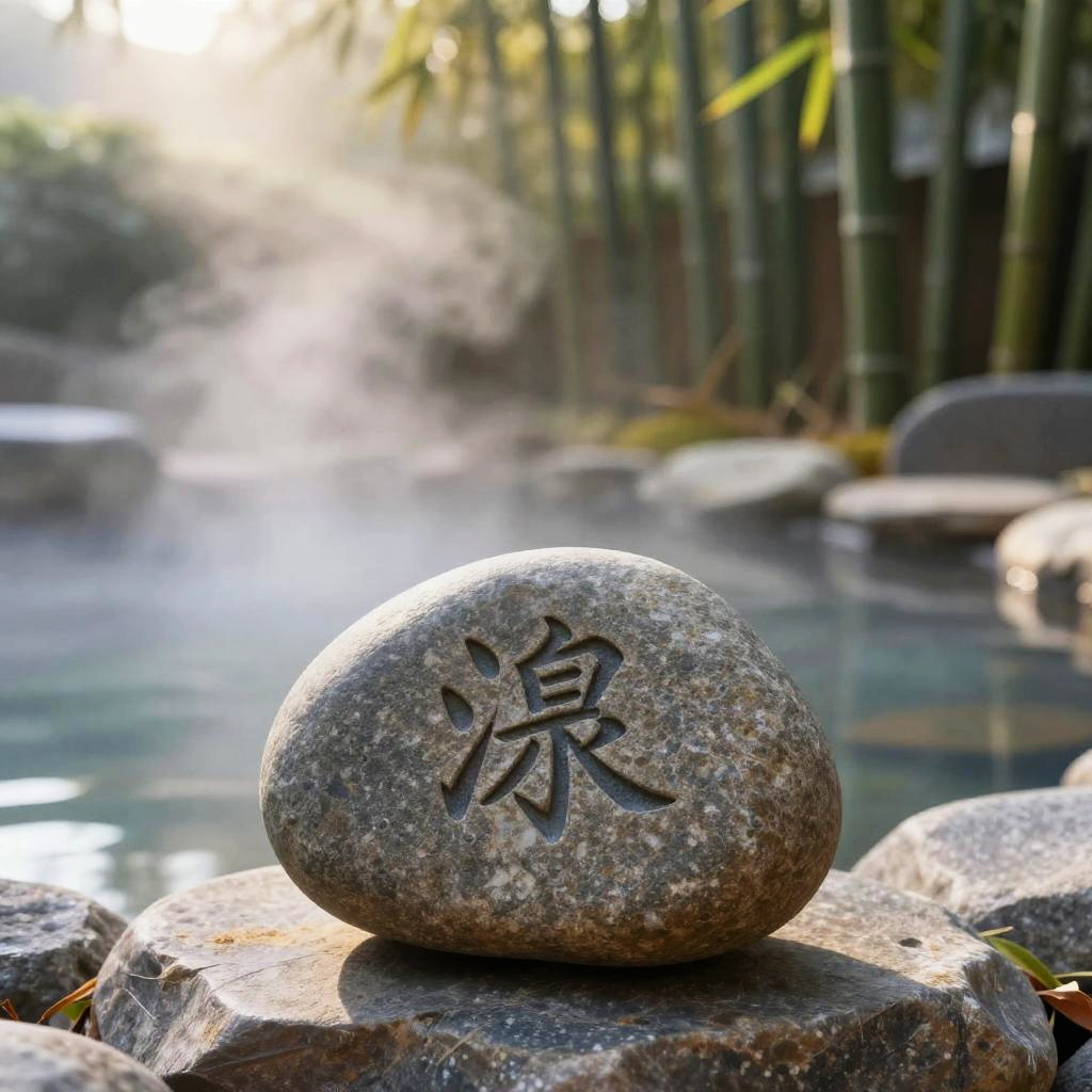 Abstract onsen symbol formed by fluid steam patterns swirling above a hot spring pool, soft pastel color palette with gentle ripples, surrounded by zen garden rocks and bonsai trees