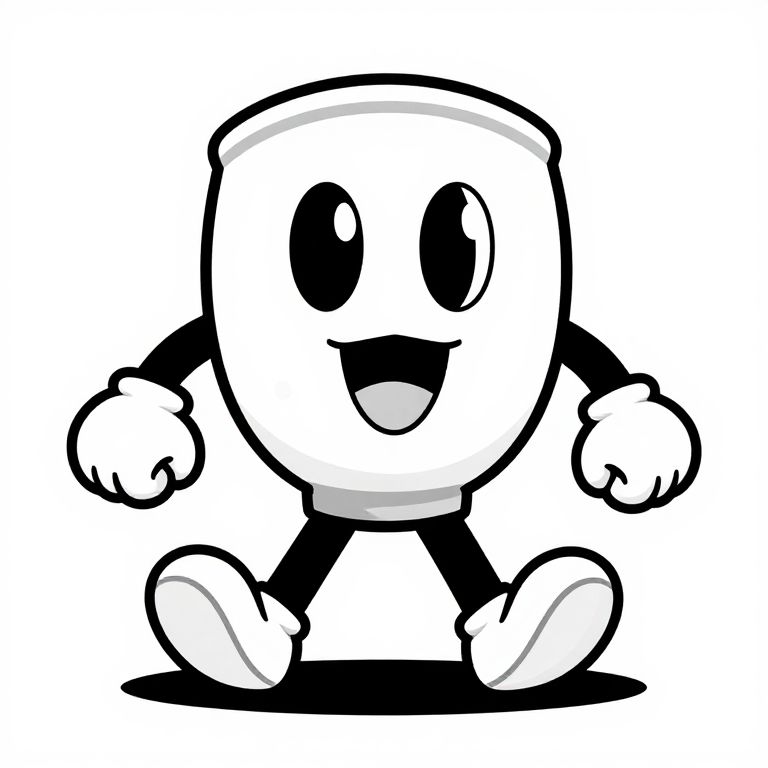 Black-and-white cartoon of a cheerful, round-headed character with large eyes, open mouth, and simple black arms and legs, sitting and smiling.