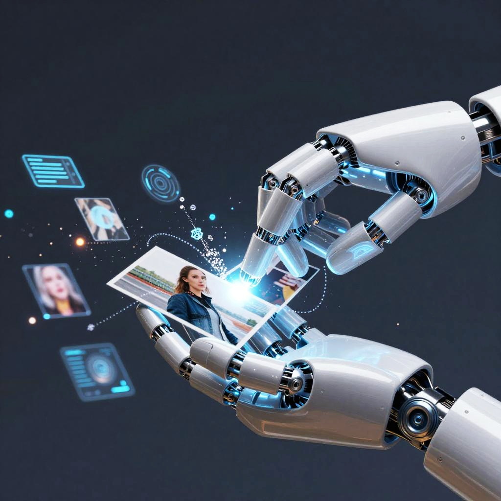 An artistic representation of an AI image replacer, a robotic hand delicately swapping photographic elements, surrounded by a flow of digital particles and interface elements, ethereal glowing effects, sci-fi inspired