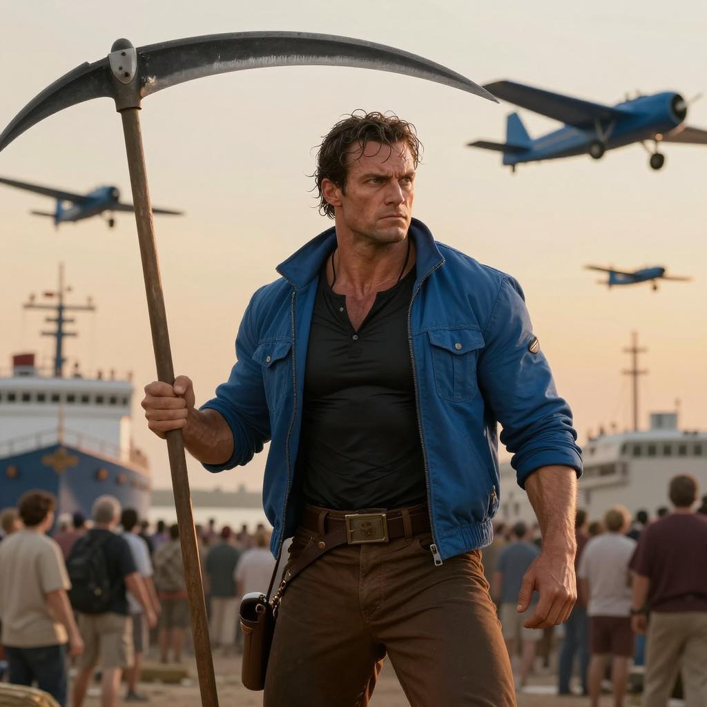 A muscular man with long, wavy brown hair and an intense expression holds a large hammer in an industrial, dimly lit environment. He is wearing a sleeveless dark shirt and a leather belt equipped with various tools. The blurred background shows a crowd of men, adding to the gritty atmosphere.