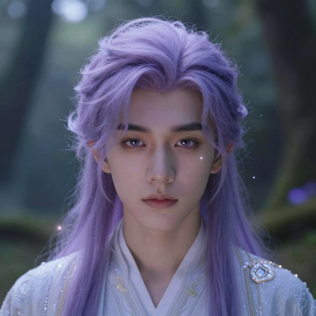 Portrait of a light purple hair boy with soft glowing eyes, surrounded by floating magical particles, ethereal forest background with mist and enchanted atmosphere, fantasy style