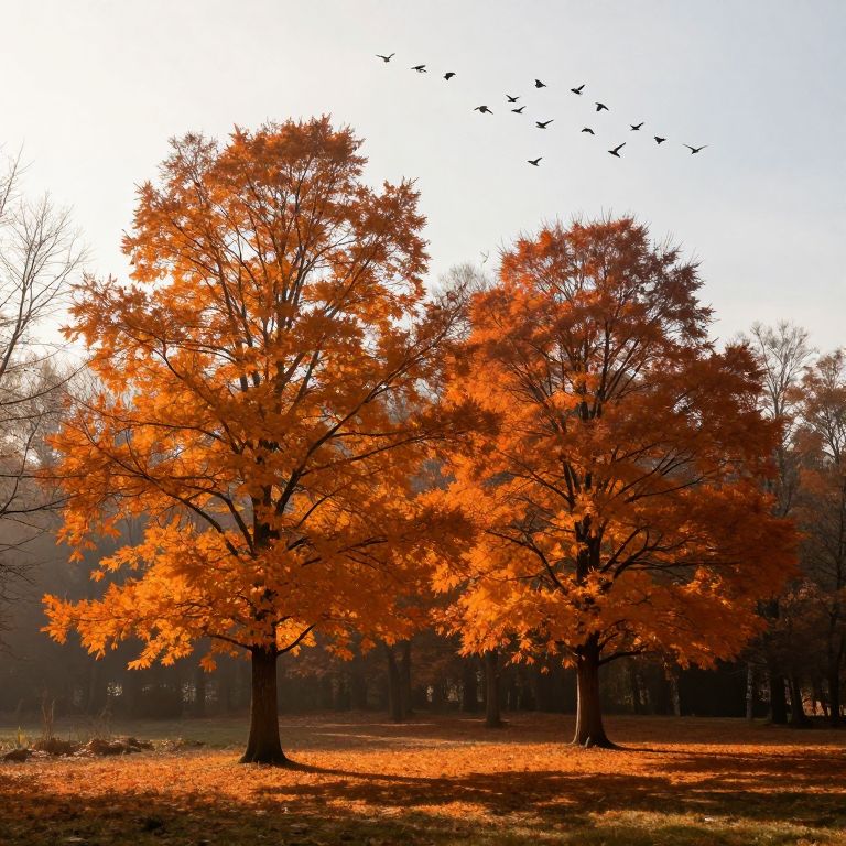 Photograph of two vibrant orange-leaved trees in a sunlit park during autumn. The trees, with their dense, fiery foliage, stand prominently in the foreground, casting long shadows on the ground. A flock of black birds flies in a V-shaped pattern across the bright, clear sky. The background includes a mix of bare and lightly leafed trees, creating a contrast with the vivid orange leaves. The ground is covered in a carpet of fallen leaves, adding to the autumnal feel. The sunlight filters through the leaves, creating a warm, golden glow.
