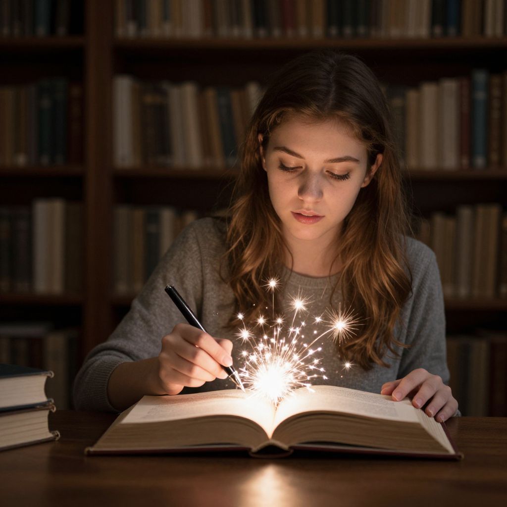 In a dimly lit library, a young woman wields a pen that ignites with radiant sparks, conjuring magical light from the pages of an open book, as if her thoughts and words breathe life into the very fabric of knowledge.
