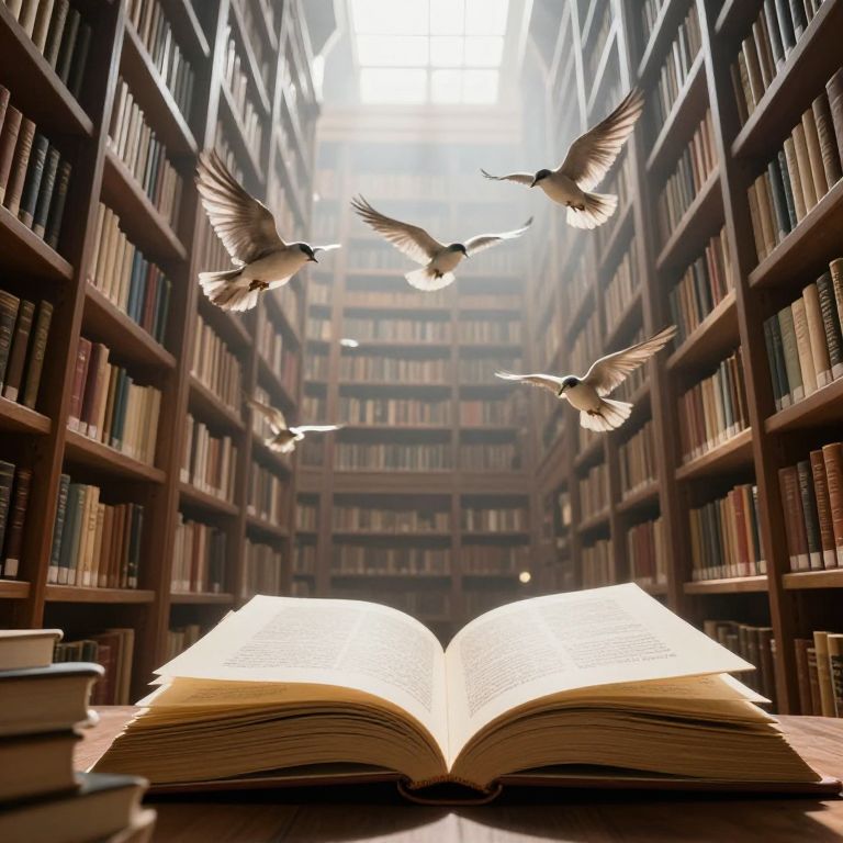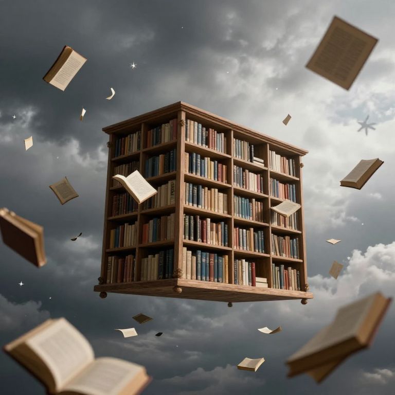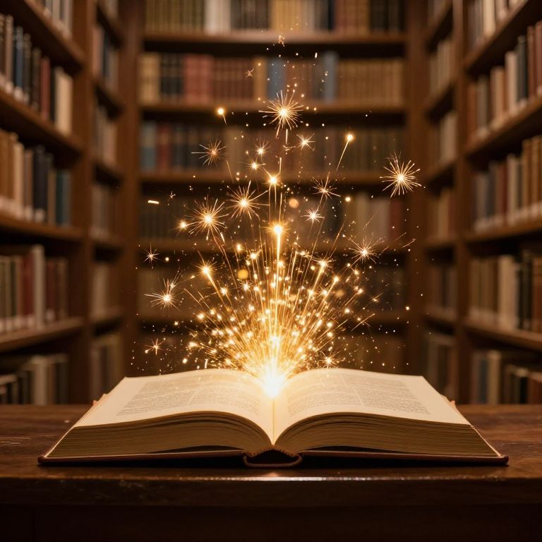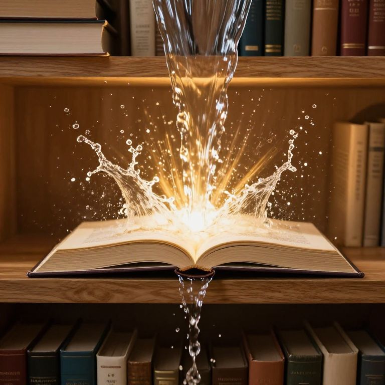 Books rest on wooden shelves as water cascades down, splashing dramatically over an open book, its pages illuminated by a radiant golden glow emerging from within, symbolizing the transformative power of knowledge.