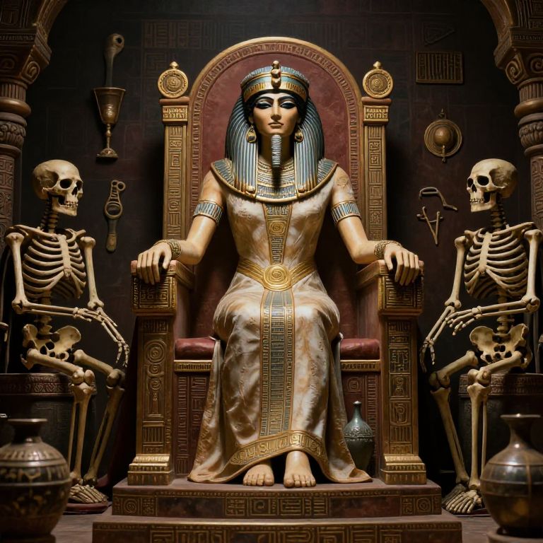 Photorealistic digital artwork of an Egyptian queen with gold headdress, seated throne, flanked by two skeletal figures in dark, ancient temple setting.