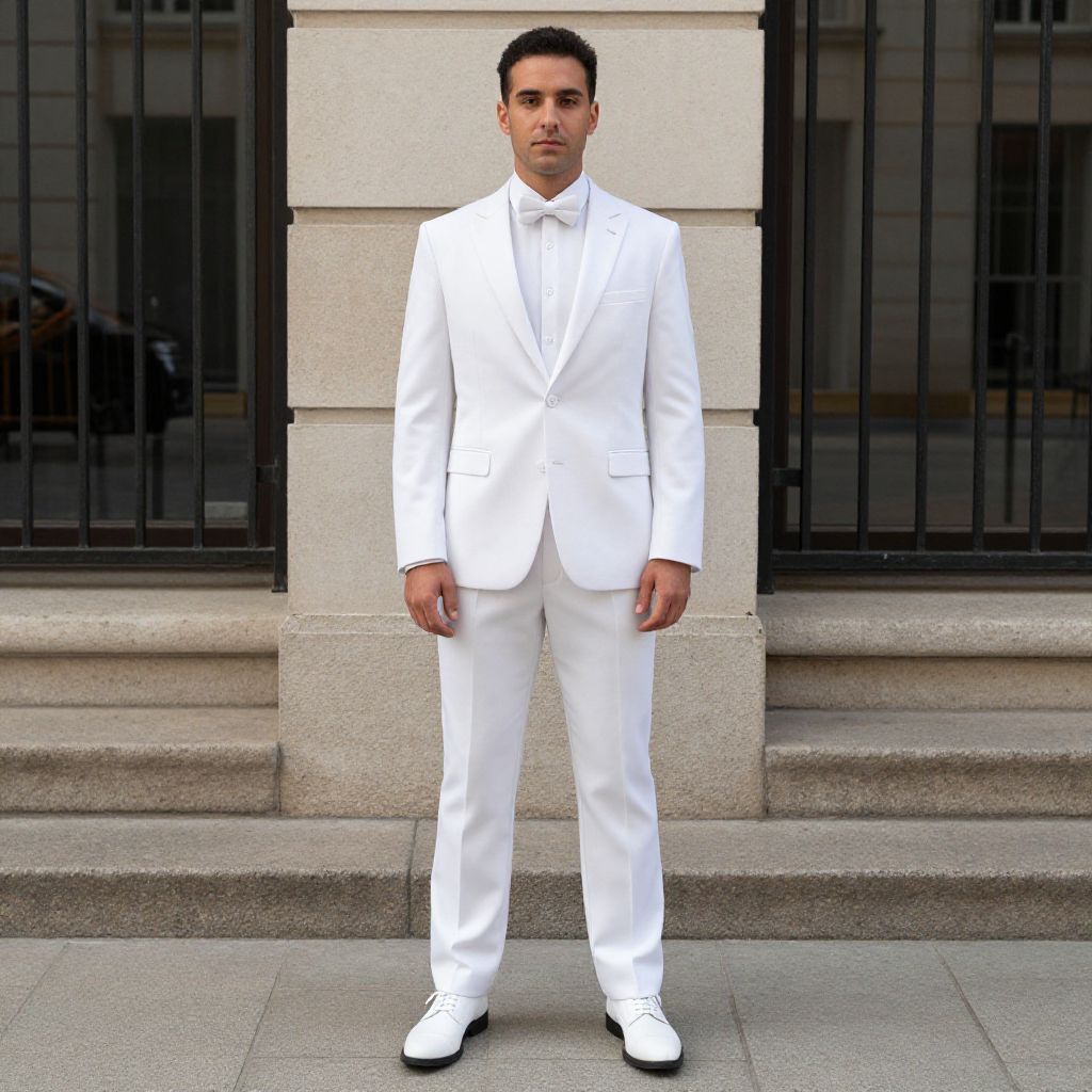 "White Party Outfit Guy Costume, dressed in a white suit and white shoes standing in front of a building"