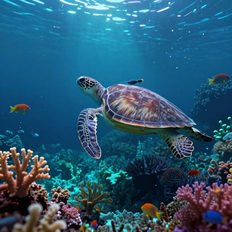 Photograph of a sea turtle swimming gracefully above vibrant coral reefs, surrounded by colorful fish and illuminated by underwater sunlight.