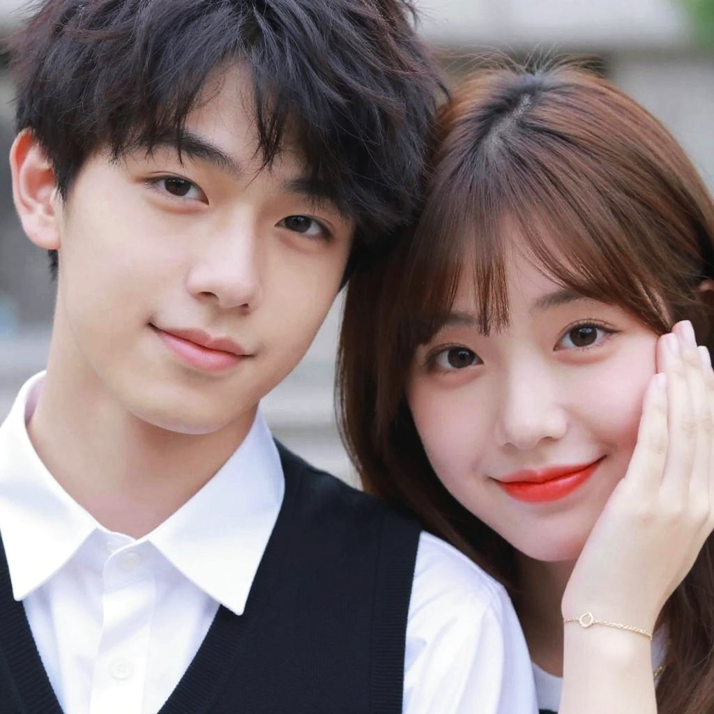 Close-up photo of a young couple. The woman, with fair skin, brown eyes, and red lipstick, has a small mole on her left cheek. She has straight, light brown hair with bangs and is holding a red object near her face. The man, with glasses and short brown hair, is partially visible, slightly behind her, looking at her with a gentle expression. The background is blurred.
