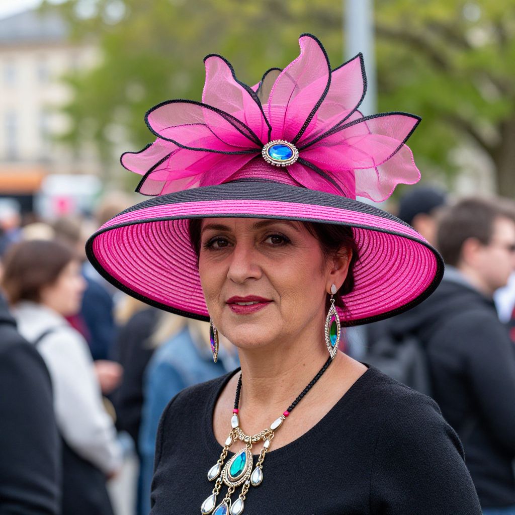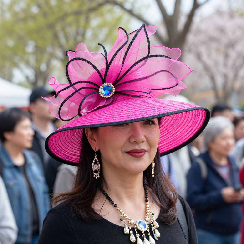 Woman wearing a vibrant pink and black wide-brimmed hat adorned with layered sheer fabric petals and a central jewel, accessorized with dangling earrings and a statement necklace, standing outdoors amidst a blurred crowd during a festive spring event.