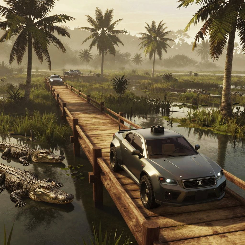 GTA 6 Everglades, dense foggy marshes with alligators lurking, a sleek armored vehicle crossing a wooden bridge, intense action scene, cyberpunk atmosphere