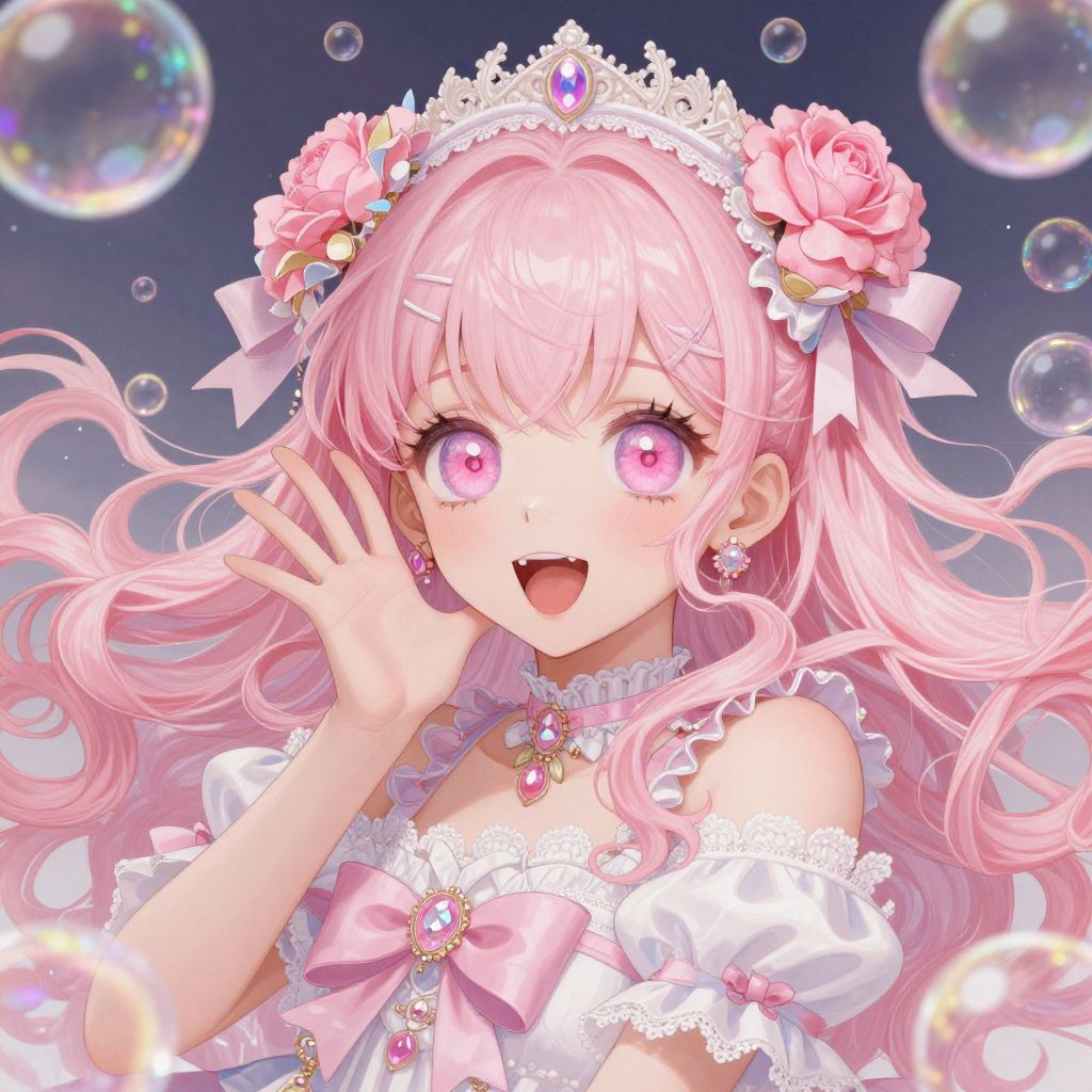 Digital anime-style illustration of a cute, young girl with long, wavy pink hair adorned with a white lace headband featuring pink roses. She has large, sparkling pink eyes and a joyful expression with an open-mouth smile. She wears a white, off-shoulder dress with pink bows and lace trim, along with pink earrings. Her right hand is raised, with fingers slightly spread. Surrounding her are translucent, colorful bubbles against a dark blue gradient background. The image is vibrant, with a focus on the girl's cheerful and whimsical appearance.
