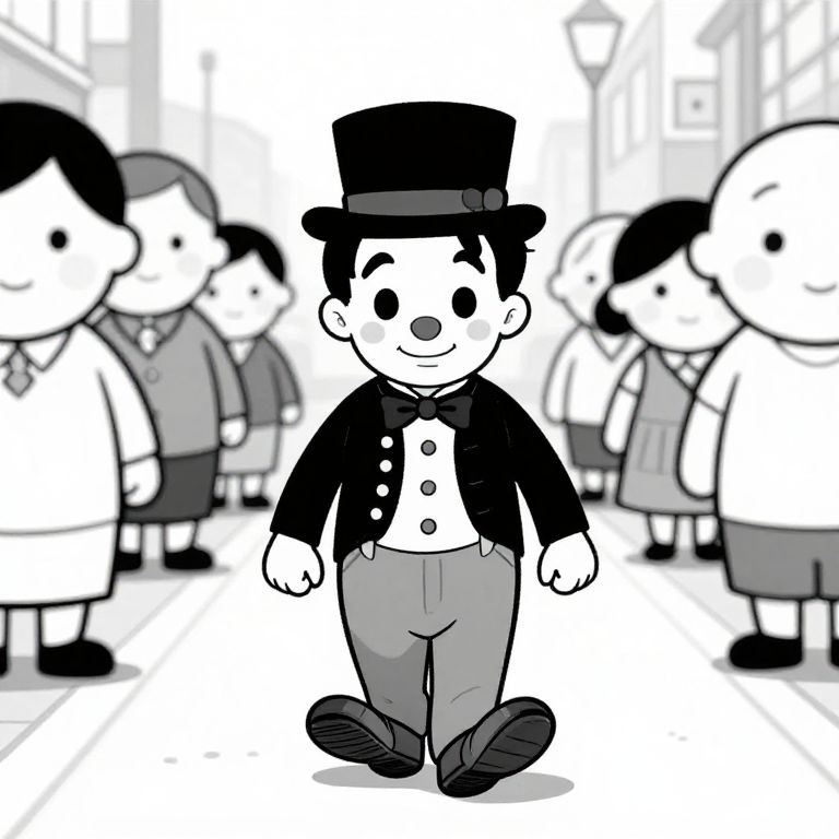Kawaii Music Charlie Chaplin charlot walking on a road,many people following him,anime style drawing,black and white,