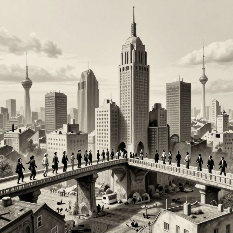 Black-and-white digital illustration of a bustling cityscape with people crossing a bridge over a street filled with vehicles and debris. Tall skyscrapers, including